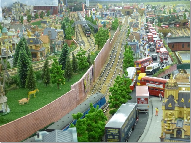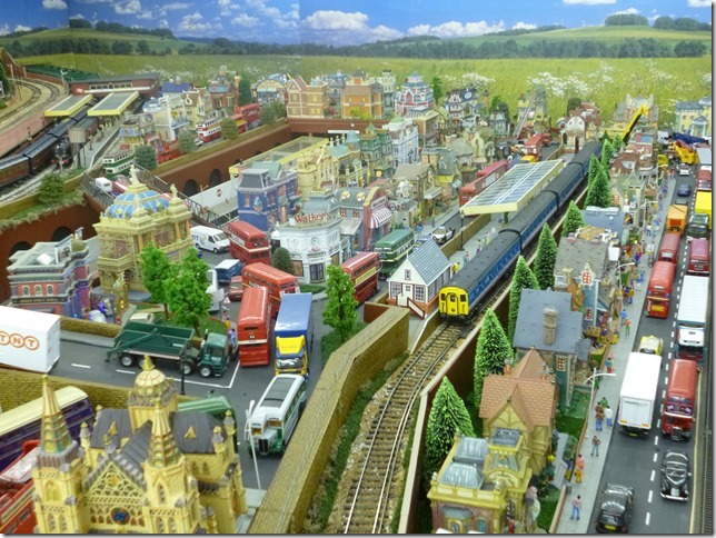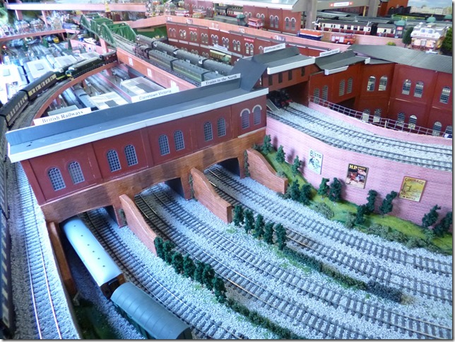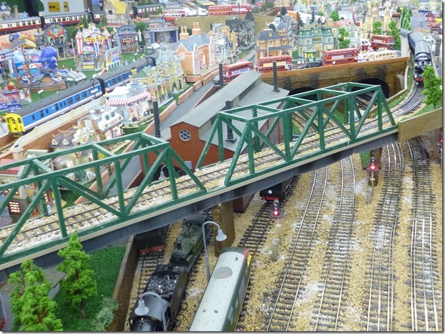 The railway lines are located on four levels. Access points for maintenance are provided at strategic points by means of hinged hatches, which is something I may struggle with in the future as I am now in my early seventies but fortunately at present in good health. Another of the aspects of this railway which are unusual is that it is primarily of urban scene rather than the usual scenic hills etc. It is fully populated with thousands of figures imported from China. To see thirty full length trains running at the same time is a sight to be savored with the imagination of the viewer. I hope you have enjoyed the description of my railway and if you would like a cab ride round part of the railway, please view the following video.