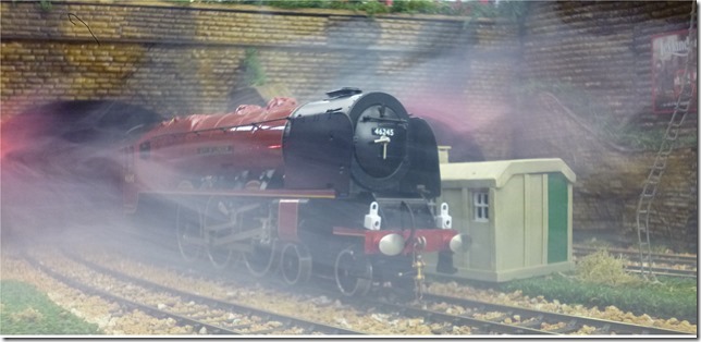 An Ace Trains Duchess emerges from a smoke filled tunnel