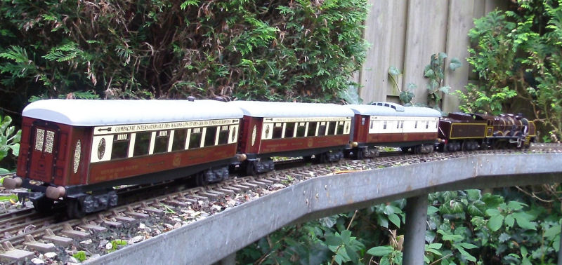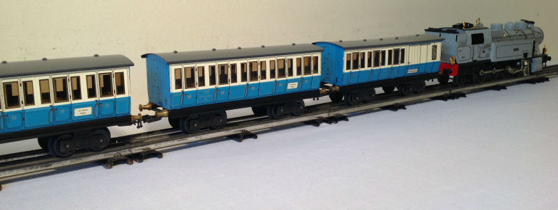 A PLM 222T with a 1st, 3rd, and 2nd class coach. There is also a Postal van (not shown) that fits in well with this consist. The coaches are 30 cm long.