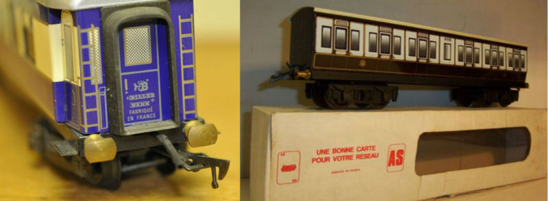 AS also produced ‘0’ gauge trains for businesses outside of France. For Highfield Models of Harrogate, England AS produced 215 English styled carriages with Hornby couplers (Ref 1. Page 23). It is also known that in the mid-80s AS produced for an Ernst Rudolf Klein of Germany four different Rheingold coaches who sold them under the Billerbahn label. The cars actually carry the Billerbahn label which was printed onto the coach by serigraphy.