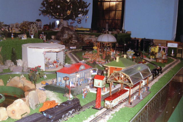 Spanning the O Gauge Main Line is an Ives glass dome train shed with green panels along the top and clear panels at the bottom. A steady flow of passengers fills the walk leading to an American Flyer big-city station. On the right is a Lionel No. 124 deluxe station with arrival and departure chalkboards by the front doors. Enlivening the brightly lit interior of the Lionel depot are figures from L & H Miniatures of Schuylkill Haven, PA, along the Reading Main Line south of Pottsville. Both cities have restored their Reading stations. These hand poured, trimmed, and painted alloy miniatures blend with older figures on the putz. Enclosing sacred and secular portions are ornamental cast iron fences made by the Dent Hardware Company, Fullerton, PA, north of Allentown and east of Route 145 (MacArthur Road).