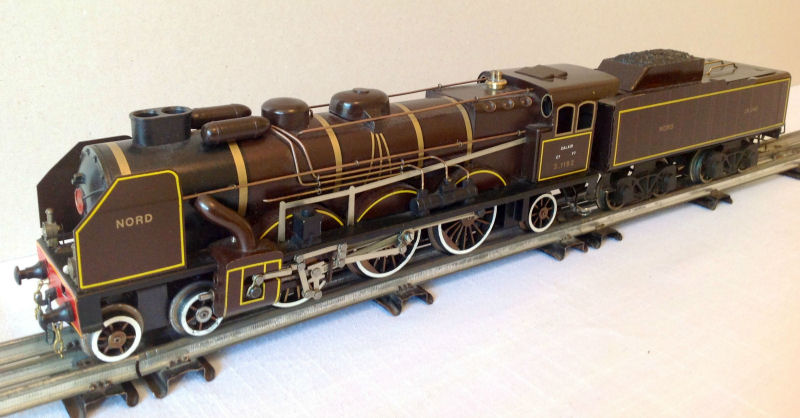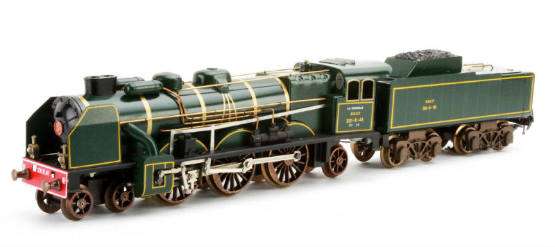 The AS tinplate model was made in both the chocolate-brown with yellow edging of the NORD and the green with yellow striped livery of the post 1938 SNCF.