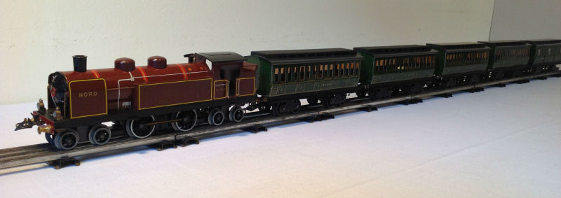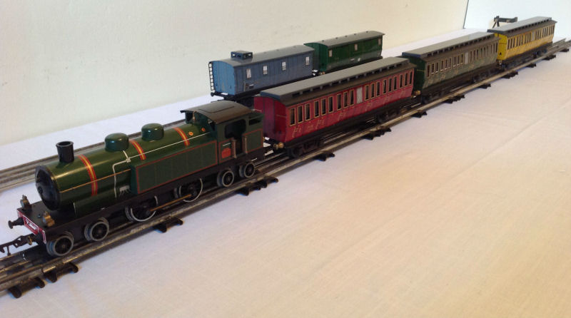 A PLM 222T with a 1st, 3rd, and 2nd class coach. There is also a Postal van (not shown) that fits in well with this consist. The coaches are 30 cm long.