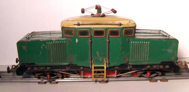 The two electric outline locomotives included a 2-B-2 (shown above,) a two-rail loco that was powered from the 110V mains using a light bulb as resistance in series with a rheostat. There was also a very similar looking 2-C-2, however this loco was three-rail, had a 20V motor, and was transformer powered.
