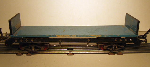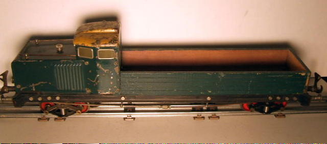 The front truck is powered. The cab is tinplate, and the car bed is wooden.