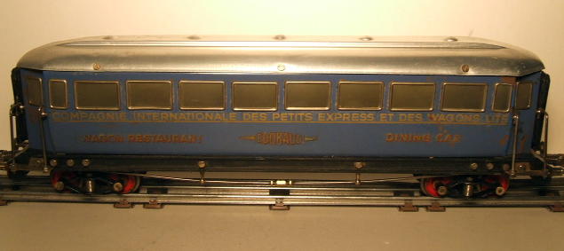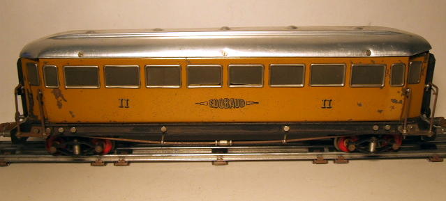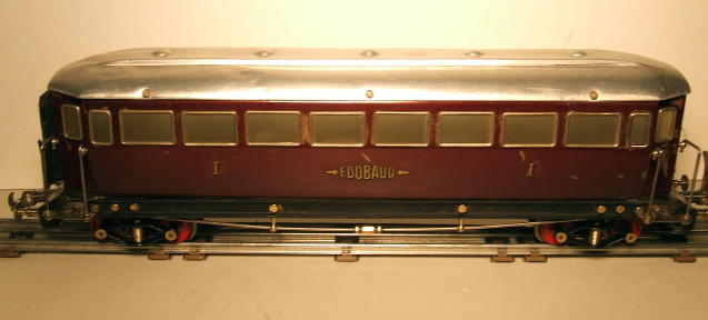 Edobaud produced eight different passenger cars: a First, Second, and Third Class Car, a Dining Car, a Sleeping Car, and a Postal And Telegraph Car. All of the these cars were 18" long, buffer to buffer, produced in tinplate, and painted a single color. They also produced a two-toned blue-cream tinplate "Pullman" car and a green tinplate "Fourgon de Queue" tail van or baggage car with sliding doors. All cars feature painted tinplate bodies, name and number decals, plain stamped aluminum roofs, individual metal and celluloid window inserts, steel hand rails, flexible end-of-car diaphragms, heavy steel undercarriages with trusses, and wooden floors. Apparently, some cars had provisions for lighting, but these are not common. The Edobaud coupling system consisted of a sprung hook and pin arrangement, and later a hook and link arrangement.