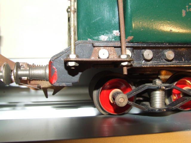Edobaud toy trains and accessories were actually hand assembled with nuts and bolts. They were made primarily out of steel, cast iron, brass, bronze, nickel, aluminum, zinc, and tinplate. In the above detail photo of an Edobaud passenger car, note that the painted tinplate body is bolted to the steel girder undercarriage. The steel frame trucks are bolted together with a single bolt holding the simulated truck spring and two separate bronze bearings in place. The wheels are brass, the buffers are zinc or aluminum, and the steel handrails are bolted to the step. There are a total of 14 bolts holding the car body to the frame, with many more nuts, bolts, and screws holding the hand rails, trusses, roof, and other hardware in place on this one car! Imagine how long it took for a worker to assemble a complete car!