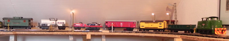 9406 boxcar, Merkur 9449 gondola, Merkur 9608 Mobil tank car and a Lionel 817