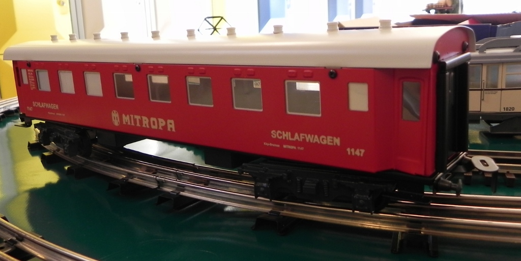 Since these passenger cars are solid metal train models, they all weigh about 800 grams each and run smoothly over the tracks. When a string of these passenger cars pass you by on tubular track, it sounds truly great. The sound is not a high pitched rattle like with Lionel 603 passenger cars, but a more deep and realistic train sound of metal trains on tubular tracks. The series of Pullman and CIWL passenger cars with interiors and interior lightening are the most beautiful passenger cars currently made by Merkur.