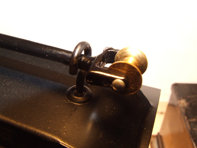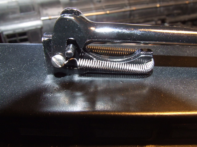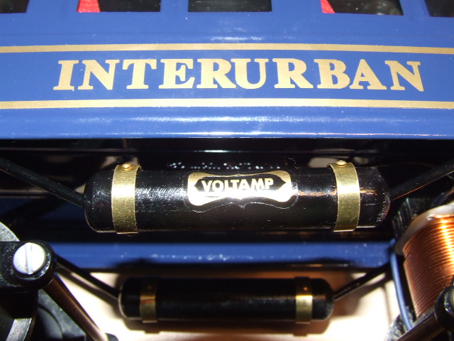 Brass overhead contact rollers. They are not electrically functional but they sure are well-made! In 1914 Voltamp offered the interurban with track feed as standard but offered trolley pole feed for $1.00 extra.