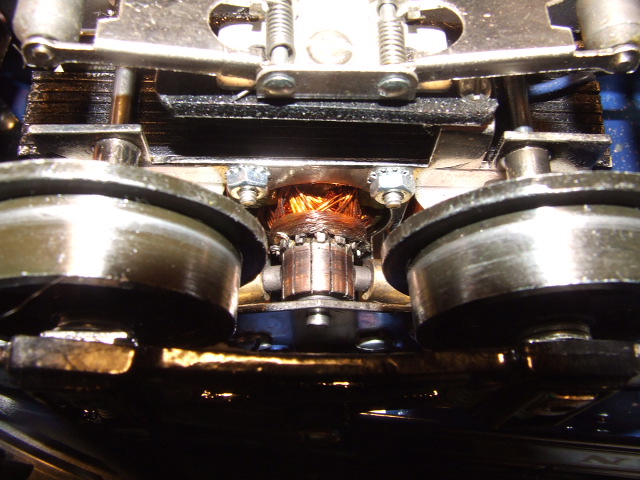 The massive motor armature and brass brush holders complemented by a nicely done roller assembly. Note that the unit is provided with carbon brushes so as to avoid excessive wear on the armature.