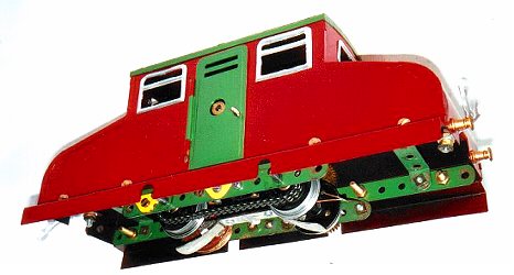 Meccano Ltd designed this steeple cab electric loco body in 1925, for use as a Meccano part in conjunction with a chassis to be made from Meccano, with a Meccano electric motor installed. It was not produced, however. Not knowing just what Meccano, Ltd. intended as a chassis design I made up my own, with gear drive to one axle, and chain and sprocket drive to the other axle.