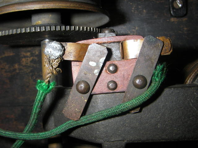 The 1902 motor brushes are made of formed strips of copper or brass alloy screwed to a fiber block, brushes that can be adjusted and are held against the commutator in tension, as described in the 1903 catalog: