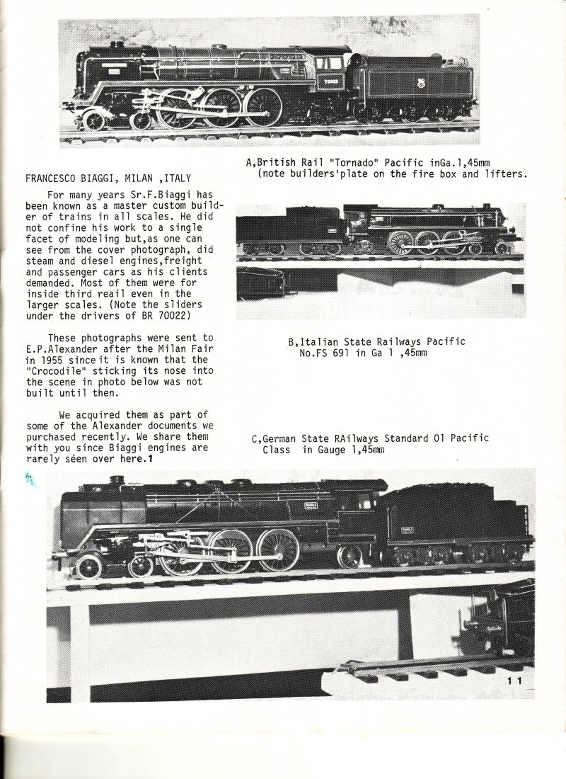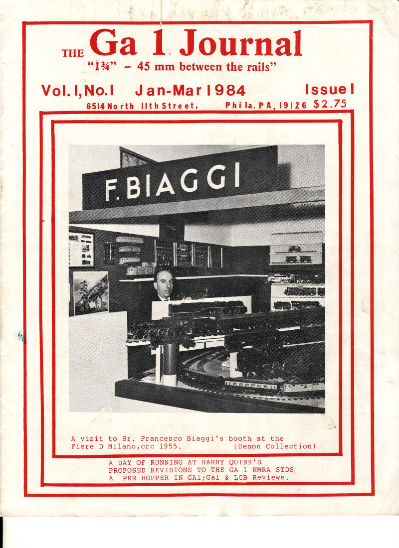 On Ebay a few months ago I noticed a listing for a copy of the Gauge 1 Journal dated Jan/Mar 1984. The cover photograph showing F. Biaggi caught my eye because Italian model train manufacturer Francesco Biaggi is an enigmatic figure in the model train world. I have not been able to find out much about him, even though he was actively manufacturing trains for decades and some of his models are quite appealing. So I purchased the journal copy offered on Ebay as well as ten additional issues up through and including issue 12 from Jan/Mar 1987. Issue No. 12 may have been the last issue, I'm not sure. The publisher was D. B Henon of Philadelphia, about whom I have been unable to find out very much. The content included in the various issues focuses on 2 rail No. 1 gauge, 1 gauge construction projects, garden railroads, and occasionally on tinplate. The following article on Biaggi from the first issue of the Gauge 1 Journal is a small tinplate time capsule!