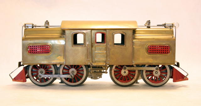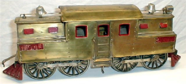 The touchstone of a real 1912 Special does not even lie in whether or not it has thin rim wheels. All of these brass bodies made in 1911 were originally stamped for slide-on headlight. They were later re-punched with a single hole between the sliding ways for a screw-on headlight and the sliding ways flattened down. A real 1912 Special would have thin drivers and sliding headlight, with no hole punched for the screw-on headlight. Very probably some of these locos were sold in 1912 as 54’s. The next type of early 54 had thin drivers and screw-on headlight. Finally, in 1915 or 1916, the supply of square brass bodies being exhausted, a new stock of brass bodies were done in the same dies as the No. 42, producing the single motor round cab No. 54, which in turn later gave way to the twin-motor No. 54.