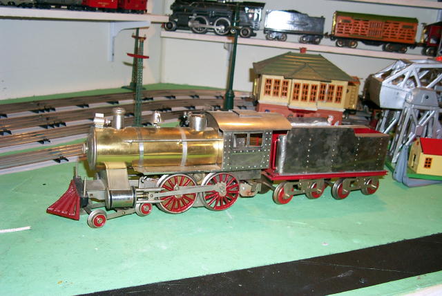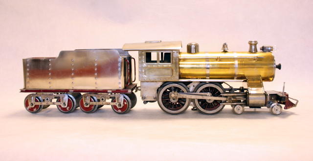 First, to recapitulate, the 4-4-0 brass and nickel steam type and tender appeared in 1909 as the No. 6 Special. It became the No. 7 in 1910 and continued under that number until last catalogued in 1923. There are several major variations, the most important being change from thin rim to thick rim driving wheels. Another point is that the brass and nickel steam type was for many years cataloged as having special phosphor bronze bearings, but this does not appear to have been carried out consistently in actual production. The number “7” had originally been assigned to a 4-6-0 type that was never put into production and, as mentioned, was only applied to the brass and nickel 4-4-0 after it had been listed for a year as the No. 6 Special.