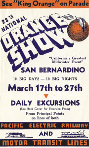 Millions of Southern Californians saw the models operate at the yearly National Orange Show. Although the railway’s exhibit was changed every year, it typically consisted of the passenger car and freight trains running on separate racks around a display that resembled a giant papier-mâché wedding cake. The display was decorated with real or imitation oranges, plus photographs and facts about the vast Pacific Electric interurban network in Southern California.