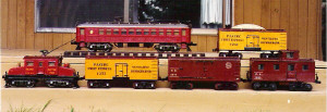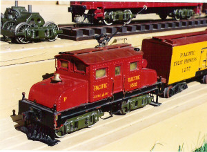 The gauge of these unique models is 2-5/8 inch. Why this particular dimension was chosen, I don’t know. I only obtained three short lengths of straight track with the models, and without expert advice, have not tried to operate them. I suspect, however, that they operate on 110 volts. These models are true museum pieces, and that’s where I hope they will end up some day.