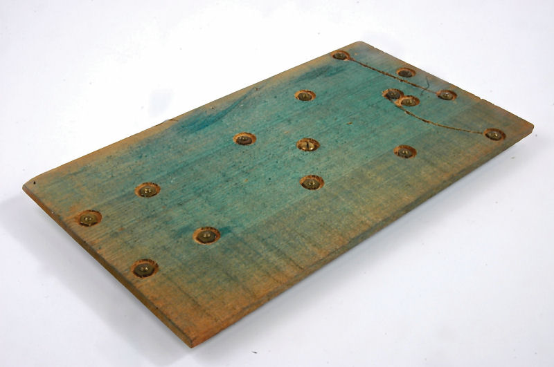 Both have wood bases dyed green (Each base measures 11” x 5-7/8”.) and brass strip rail.