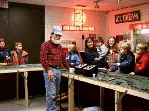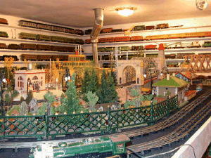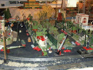 This is an interactive display 12' X 17'. There are door bell buttons located around the module so all kids young and old can run the trains and operate the accessories. At the last display visitors were invited to bring their trains to run. Many people bring trains and are very happy to find out there are other people in town with the same interest that they have.