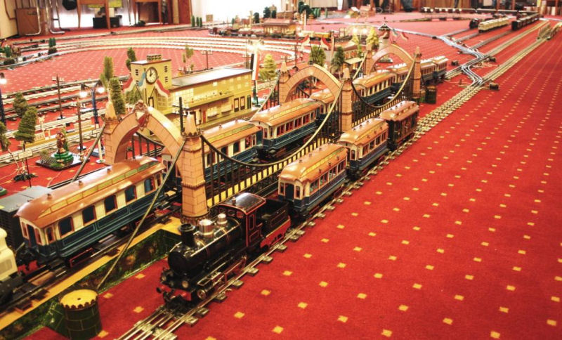 Herr Wolfgang Bauer built this replica of Markln’s first suspension bridge produced from 1899 – 1904. Suitable for Gauges 0, 1, and 2, Herr Bauer expanded the bridge by extending the bridge ramps and adding a central arch, resulting in a very attractive bridge that is 3.15 meters, or 10 1/3 feet long. Both next to the bridge and on the bridge are Bauer restorations of Marklin’s coaches used in their Court train of the German Emperor, the “Kaiser car train”. Marklin produced the train with a dining room, sleeping car, saloon car, and lounge car.