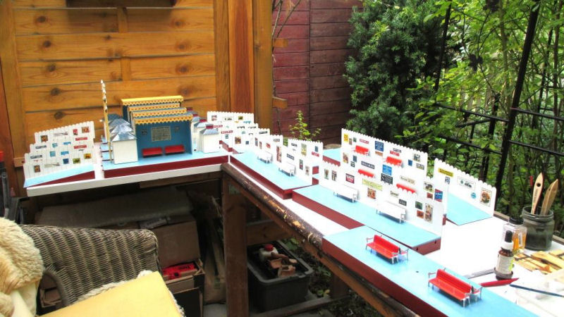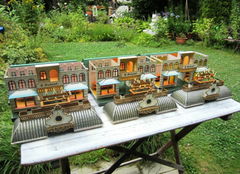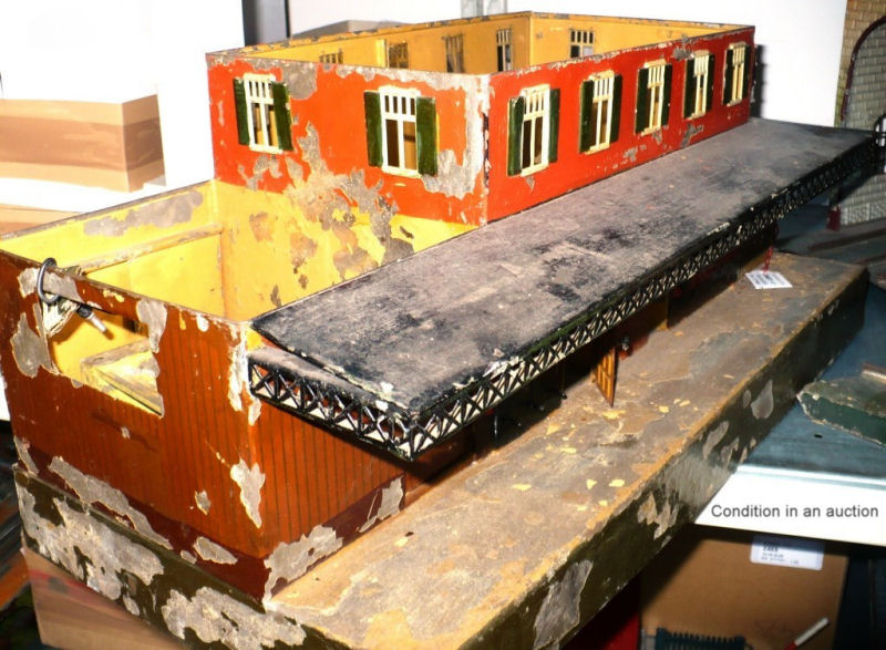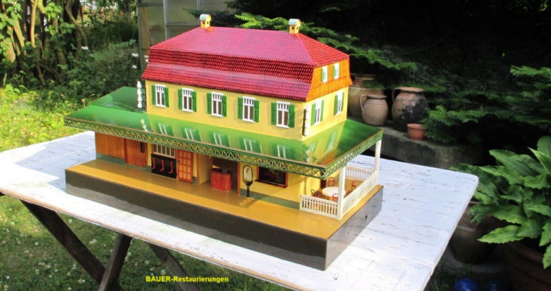 This Gauge 1 Marklin train station no. 2031 (made in 1920) was sold at auction in derelict condition. It lacked all the roofs, the "beer garden furniture", and was painted over. After completing metal repairs (new production roofs and beer garden furniture) and removing the old paint to find that there was almost no original color remaining, the station was repainted and is shown below in its like new condition.