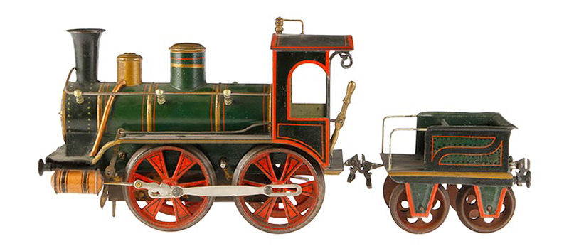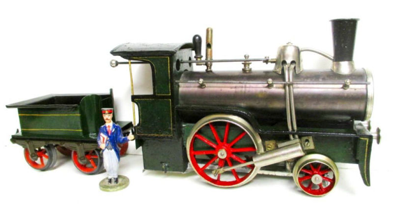 This Gauge 2, live steam locomotive, known as a “Stork Leg” locomotive, was produced by the Schoenner company of Nuremberg around 1902 to 1904. These locomotives are called “Stork Legs” because they had fairly long drive rods, one on each side of the locomotive, powering a large single wheel. They had an ungainly motion, like a walking stork, when moving down the track.