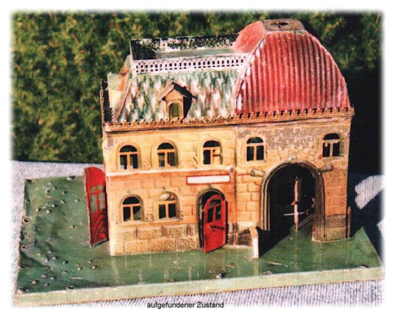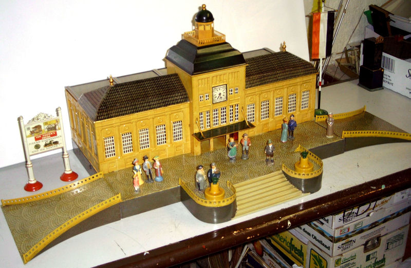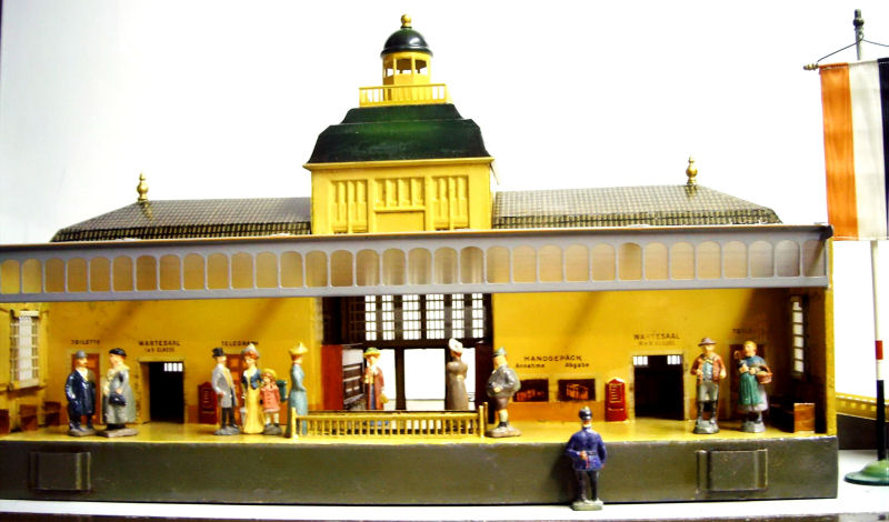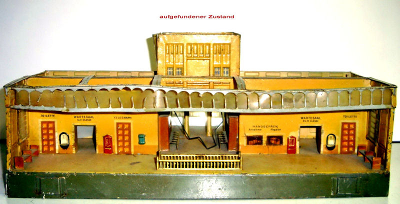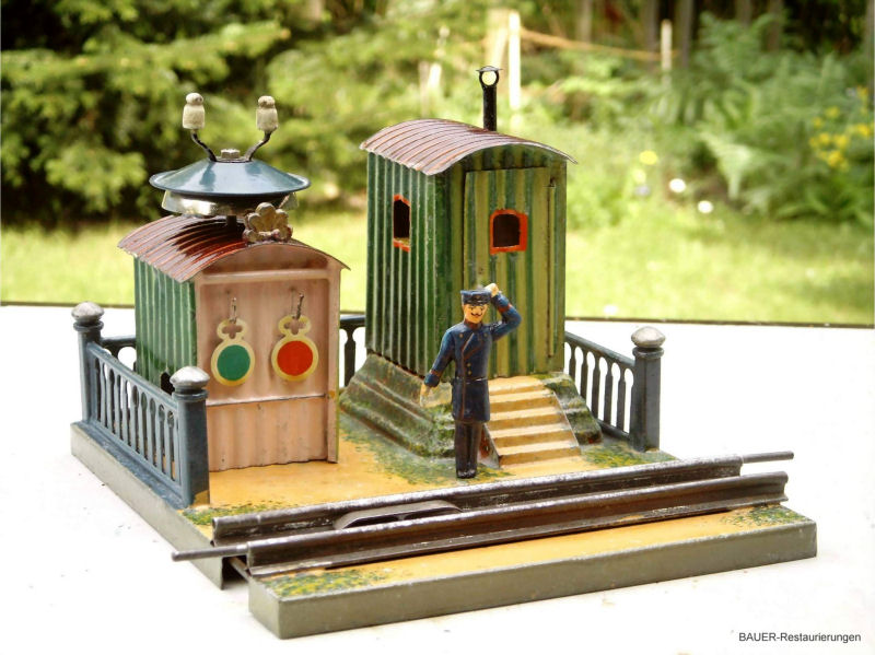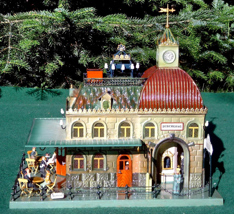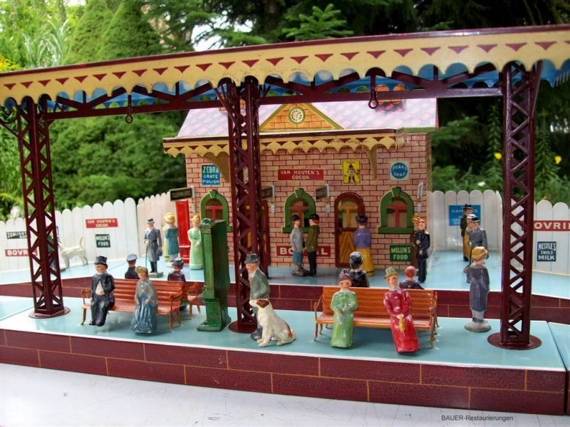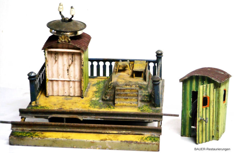Toy railroads needed more than just locomotives, wagons, and track to function. They needed a wide variety of accessories, such as railway stations of all sizes, covered train sheds, track crossings, newsstands, turntables, yard buildings, bridges and tunnels, toy figurines etc. The early toy train manufacturers produced hundreds and hundreds of these items. Today these train accessories with their ornate metal structures and their elaborate color schemes are the prized possessions of many collectors. And today there are many of these treasures that are in derelict condition and need the skills of a gifted restorer to bring them back to their original condition. Wolfgang and Birgit Bauer are known for their beautifully restored stations. Displayed here is only a small sample of their restoration efforts.