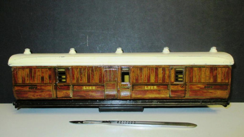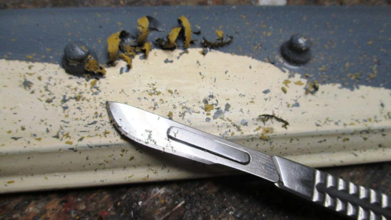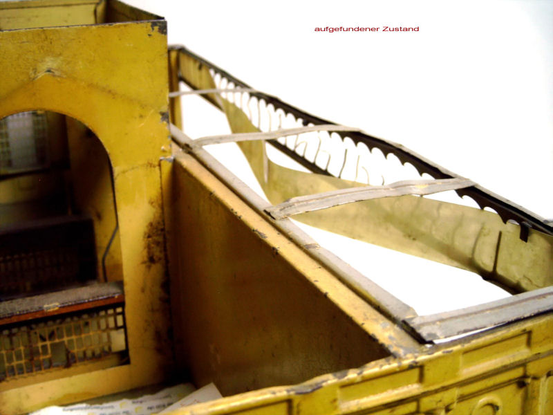 In the above photo a roof from a LNER coach has been painted over in a gray color. With a modern tool (scalpel), the gray paint is carefully removed and the original paint can be seen. In this project, 95-98% of the original paint of the roof is, after the delicate procedure, again available. The result is near perfect!