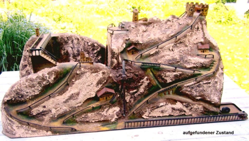 An interesting detail in these tunnels, which unfortunately can’t be seen in the photos, is Marklin’s use of small glass beads (1 mm) that are scattered on the “mountain side”. When struck by light these beads produce the surprising effect of glittering ice crystals or snow! The Bauers, of course, reattached new glass beads and, like a 100 years ago, the mountain “sparkles again”.