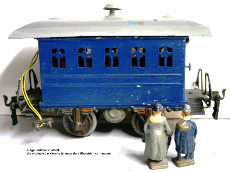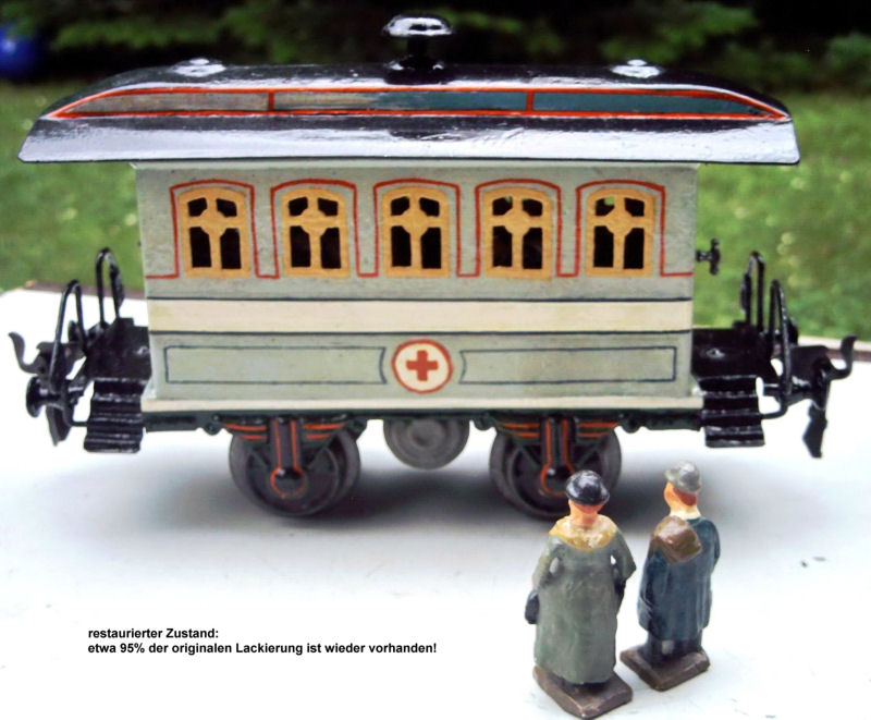 Above a Marklin Gauge 1 hospital car (produced 1902-1904) car has been painted over with "new" color, the original interior is missing, and the inside of the car was extensively modified, including the drilling of holes, to poorly install a “light”. The result was a sought after car that had no value. Herr Bauer removed the “new” exterior paint completely and corrected the interior changes back to the original. Nearly 95% of the original paint was rescued to its 1902 color. The interior furnishings and the figures were produced in the Bauer workshop as replicas. The car is now a highly valuable collectable!