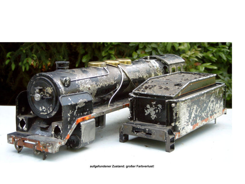 This battered locomotive is a sought after collector's item. The 1 gauge Pacific was produced by BING (11/8105) only for a short time around 1930. The BING model was a good representation of the DRG Class 01 “Pacific” 4-6-2 locomotive. Unfortunately, the loss of the original paint on this 1 Gauge model locomotive is very significant. The only solution was a total repaint. The result is the stunning locomotive shown below.