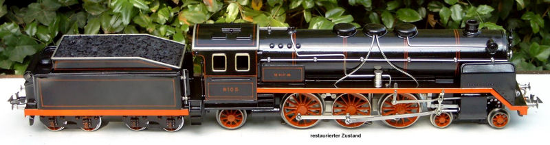 The locomotive pictured below is a rare Gauge 3 toy train ( #1023 RNN) produced by Marklin between 1896 and 1898. The locomotive and a number of cars were found at a flea market in 1999. The craftsmanship of the restoration is evident.