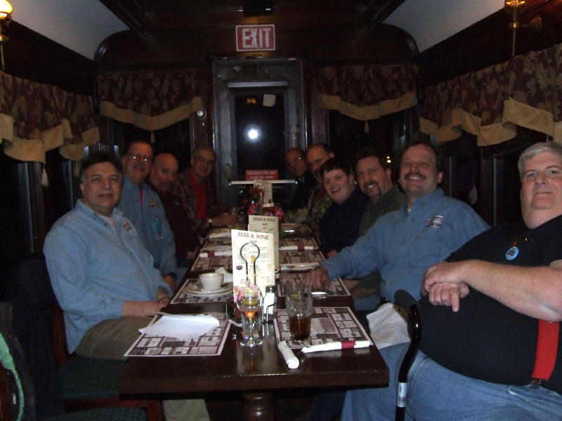 Having dinner in the Biela observation car were SGMA members and friends (L-R) Jim Cottzolla, Jim Kelly, Pat Rolland, Clem Clement, Kirk Lindvig, Chuck Lindvig, Ryan Gillette, Joe Zarnowski, Chris Bogus and Bruce Gillette...Also Renee (taking the picture.)